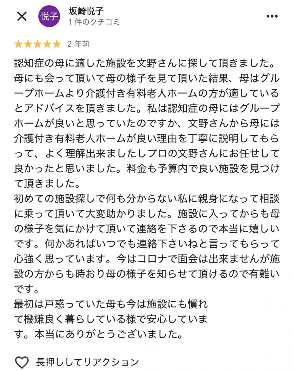 大阪府 お客様からいただいたありがたいお声① - 大阪の老人ホーム紹介はワントップパートナー谷町店
